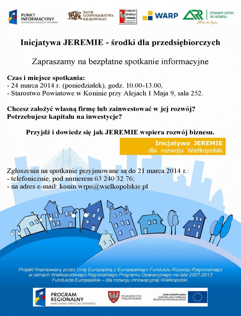 Bezpłatne spotkanie informacyjne „Inicjatywa JEREMIE szansą dla przedsiębiorców” odbędzie się 24 marca 2014 r. w konińskim Starostwie. Punkt Informacyjny Funduszy Europejskich zaprasza przedsiębiorców z subregionu konińskiego poszukujących kapitału na inwestycje.