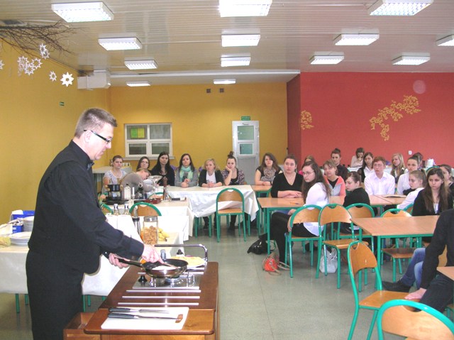 Uczniowie z Żychlina mogli przećwiczyć sporządzanie potraw w obecności gościa: flambirowanie naleśników, filetowanie owoców, przygotowanie homara oraz fondue. Grzegorz Górnik podzielił się swoim doświadczeniem w nakrywaniu stołów, doborem odpowiedniej zastawy stołowej, dekantacją wina, jak również czarowaniem gości podczas bezpośredniej obsługi. Zaprezentowane triki kelnerskie wzbudziły również duże zainteresowanie wśród uczestników warsztatów. Jak zauważyła Elżbieta Sell – organizator warsztatów- niewątpliwą atrakcją dla uczniów była możliwość podglądania mistrza w sztuce usługiwania, sporządzanie potraw wraz z technikami ich podawanie oraz możliwość próbowania takich specjałów jak: homar po królewsku, tosty z kawiorem, fondue, czy płonące crepes Suzette.