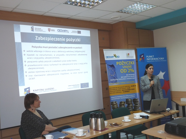 W pierwszej części spotkania Dorota Szkudlarek z konińskiego PIFE przedstawiła działalność Punktu Informacyjnego w Koninie oraz bieżące informacje dotyczące WRPO 2007-2013 i nowej perspektywy finansowej 2014-2020. W dalszej części Magdalena Nowak ze Stowarzyszenia Ostrowskie Centrum Wspierania Przedsiębiorczości dot. mikropożyczek – projekt „Moja firma z pożyczką”. Zebrani wysłuchali również pani Agnieszki Fusińskiej, która mówiła o dokumentacji i zasadach wsparcia zwrotnego oferowanego przez Stowarzyszenie Ostrowskie Centrum Wspierania Przedsiębiorczości w ramach Inicjatywy JEREMIE.