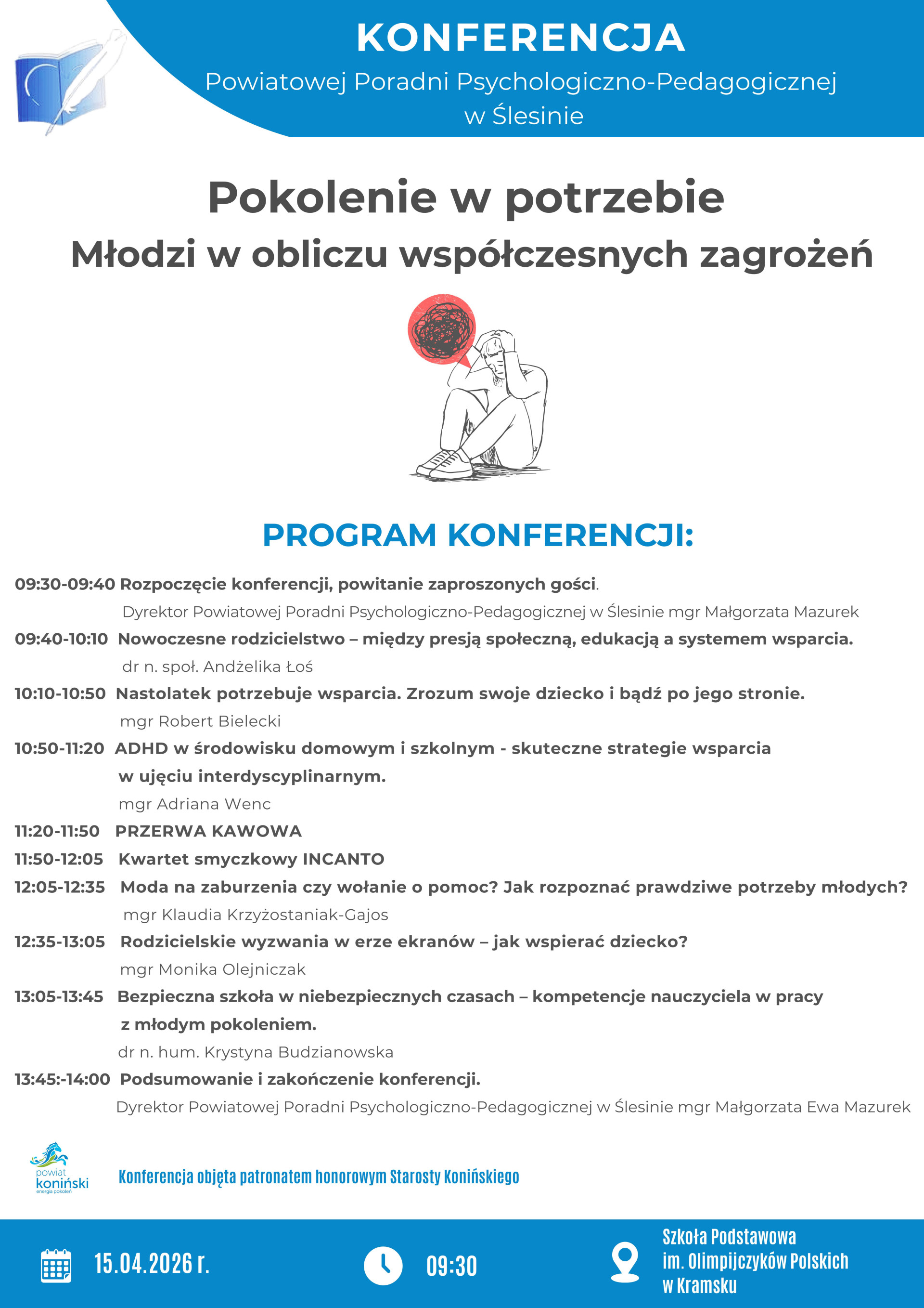 Powiatowa Poradnia Psychologiczno-Pedagogiczna w Ślesinie zaprasza na konferencję pt. „Pokolenie w potrzebie. Młodzi w obliczu wyzwań współczesnego świata”. Wydarzenie odbędzie się 15 kwietnia, o godzinie 9.30 w Szkole Podstawowej im. Olimpijczyków Polskich w Kramsku.