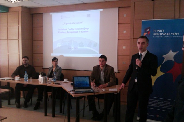 Ponadto konsultantka Punktu Informacyjnego omówiła działalność PIFE oraz zasady ubiegania się o wsparcie w ramach Inicjatywy Jeremie w Wielkopolsce. Uczestnikom spotkania przekazano także informacje nt. projektów dostępnych na platformie www.inwestycjawkadry.info.pl oraz założeń nowej perspektywy finansowej 2014-2020. Z kolei Grażyna Pawlak – Kierownik Wydziału Rynku Pracy z Powiatowego Urzędu Pracy w Koninie omówiła zasady wsparcia bezzwrotnego w 2014 r. na rozpoczęcie działalności gospodarcze, natomiast Magdalena Nowak – przedstawicielka Ostrowskiego Centrum Wspierania Przedsiębiorczości przedstawiła ofertę mikropożyczek finansowanych z Europejskiego Funduszu Społecznego (EFS) oferowane w ramach projektu „Moja firma z pożyczką”.